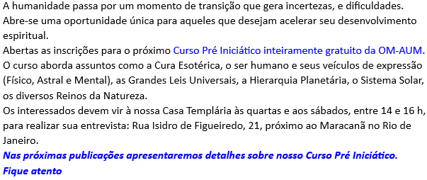 Abertas as inscrições para o próximo Curso Pré-Iniciático inteiramente gratuito da OM-AUM. O curso aborda assuntos como a Cura Esotérica, o ser humano e seus veículos de expressão (Físico, Astral e Mental), as Grandes Leis Universais, a Hierarquia Planetária, o Sistema Solar, os diversos Reinos da Natureza. Conhecimentos que nos permitem evoluir espiritualmente, nos capacitando para enfrentar as dificuldades atuais. Ele possibilita aos participantes estabelecer os primeiros contatos com a instrução iniciática da OM-AUM, que visa tanto o desenvolvimento pessoal quanto a preparação para iniciação em nossa Casa onde, futuramente, os conhecimentos serão colocados em prática.